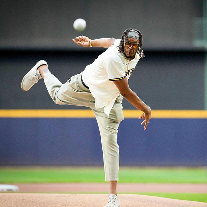 雷速体育9月29日讯 本赛季MLB例行赛收官战中,密尔沃基酿酒人主场迎战辛辛那提红人。本场比赛,酿酒人也邀请了同城NBA球队雄鹿的新援中锋迈尔斯·特纳担任开球嘉宾。今夏特纳4