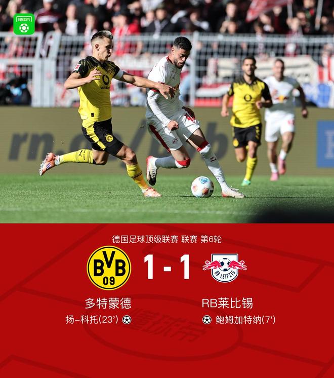 北京时间10月4日,德甲联赛第6轮展开较量,多特蒙德坐镇主场迎战RB莱比锡。比赛开局阶段,莱比锡率先打破僵局,阿桑-韦德拉奥果头球摆渡助攻,鲍姆加特纳冷静施射建功。此后多特蒙德展开反击,吉拉西做球,扬-科托抓住机会扳平比分。最终,双方以1比1握手言和。